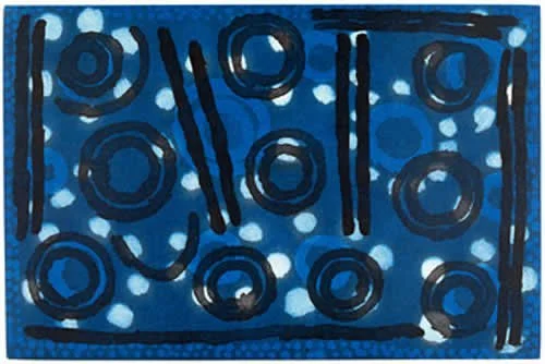 This story is for the Naparrula and Nakamarra women (mothers and daughters and Jupurrula and Jakamarra men (fathers and sons) skin groups. The print shows ant nests interconnected with the tracks of the ants as they collect grass seeds to turn in to milk for their baby ants. Kulukuku, the bush pigeon, also gathers grass seeds that have fallen to the ground while the women gather seeds from the long stems and use them to make damper. This Dreaming takes place near the Granites in the Tanami Desert at a place called Miya Miya.