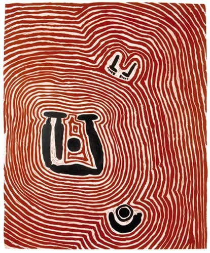 The artist has depicted part of the story for the Wati Kutjarra Tjukurrpa or Two Men Dreaming, in the country south of Balgo. The central shapes are the two brothers sleeping by their fire in country called Yayarr. The Wati Kutjarra Tjukurrpa is an immensely significant story for a number of Indigenous Australian groups. In their ancestral journeyings, these Two Goanna Men traversed a very large expanse of land including that of the Warlpiri, Pintupi, Kukatja, Walmajarri and Ngardi peoples, as well as even further afield, through the Pitjantjatjara lands. The story arose as a result of the lawlessness of a lustful old man of the Tjungurrayi skin group who lived with many women with whom he had sexual relations, regardless of whether or not they were in the ‘right’ kinship affiliation. Whenever boy children were born to any of his wives, Tjungarrayi would order the babies to be killed. By ordering the deaths of the boys, Tjungarrayi was clearly getting rid of potential sexual competitors. Eventually two baby boys were born at around the same time, to two of Tjungarrayi’s many wives. The two young mothers defied their husband, taking the two babies far away from where the group was camped, to a place obscured by a large sandhill, where first they breast-fed their infants and then later, clandestinely smuggled food for the children to eat. The two boys thrived, growing to healthy manhood, all the time plotting to take their revenge on their father. The print is a visual depiction of an event which takes place much later in the Wati Kutjarra Dreaming sequence, when the two young men are fully grown. After some time the two, who by now were young men, put their plan into action. They visited their father’s brother, another Tjungarrayi, who lived some distance away and managed to convince him that their father intended to prey upon and steal that particular brother’s wives.