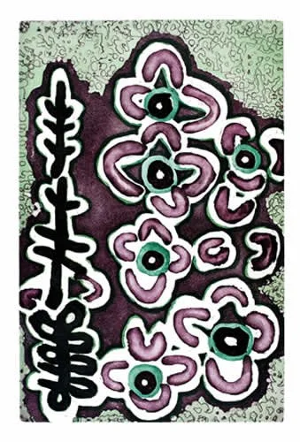 This print and its companion Purnyarnita I depicts some of Lucy’s country far to the south of Balgo, in the Great Sandy Desert. This country is known as Punyanita and is named for the soakwater, or tjurrnu, featured in the centre of the painting. Tali, or sand dunes dominate the landscape of the area, while purra (bush tomato), tjunta (bush onion) and karnti (bush potato) are commonly found here. The small dots depict the variety of these foods. The U shapes represent women performing ceremony to ensure the bush foods will remain abundant and maintain their strong connections with country.