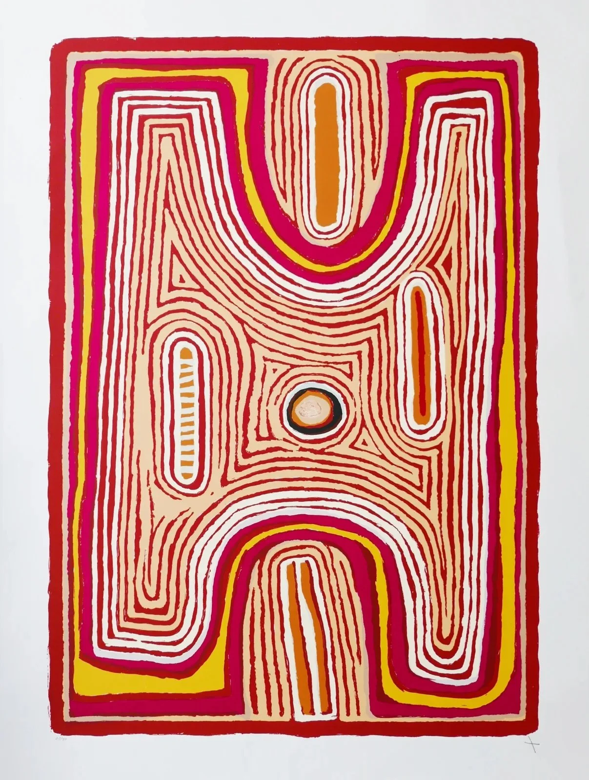 Tjumpo Tjapanangka’s print tells some of the story of the Wati Kutjarra, a prominent Dreaming in the Tanami and Great Sandy Deserts. The Wati Kutjarra were two ancestral brothers who travelled large areas of the Central and Western Deserts teaching ancestral people about food, fire and hunting. This print depicts the travels of the Wati Kutjarra to Wilkinkarra (Lake Mackay). The two oblong shapes represent the two brothers where they lay down to sleep and the impressions they left behind are seen in the country today. The central circle depicts the fire they lit that morphed into a rockhole. At either end of the painting, wuungku or wilytja (protected area or windbreak) made of spinifex are depicted. These protect the men during ceremony. This print represents an important men’s ceremony, the details of which cannot be disclosed.
